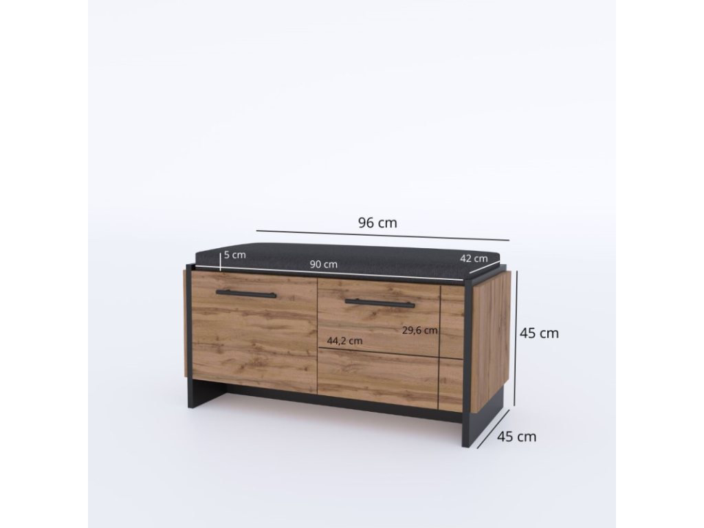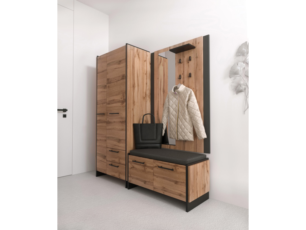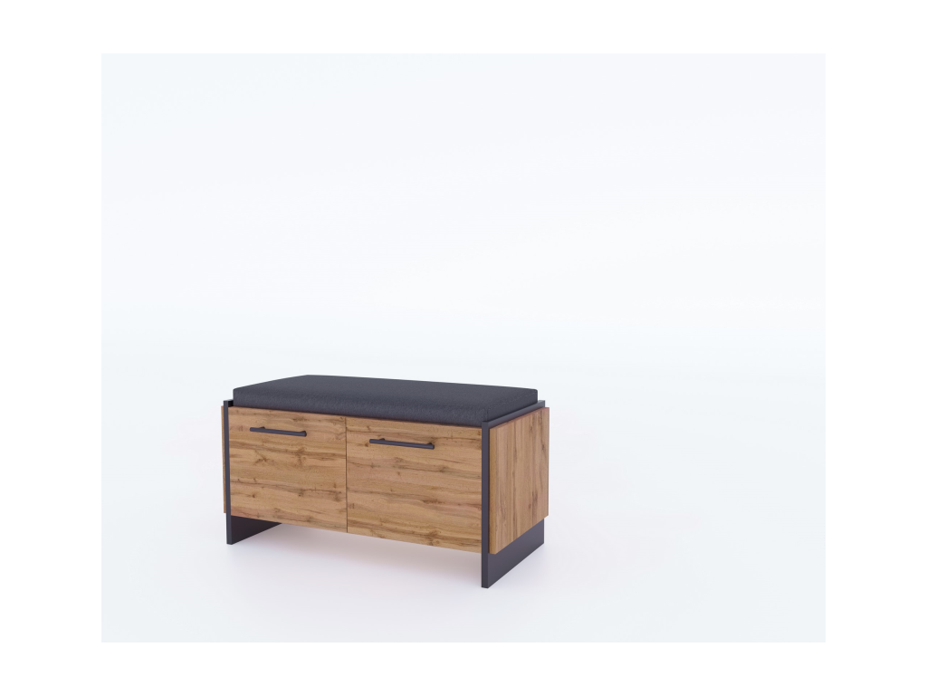 Botník AMINI je botník do předsíně vyrobený z lamino desek v odstínu dub wotan/černá. Praktický botník AMINI s pohodlným sedákem v moderním designu dub Wotan a černé. Nabízí úložný prostor za dvěma dvířky a zároveň komfortní místo k sezení při obouvání. Součástí je i měkký sedák v šedé barvě. Ideální řešení pro stylovou a vždy uklizenou předsíň.