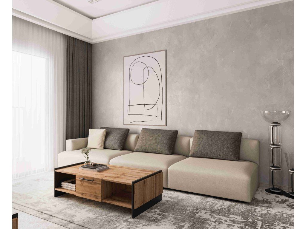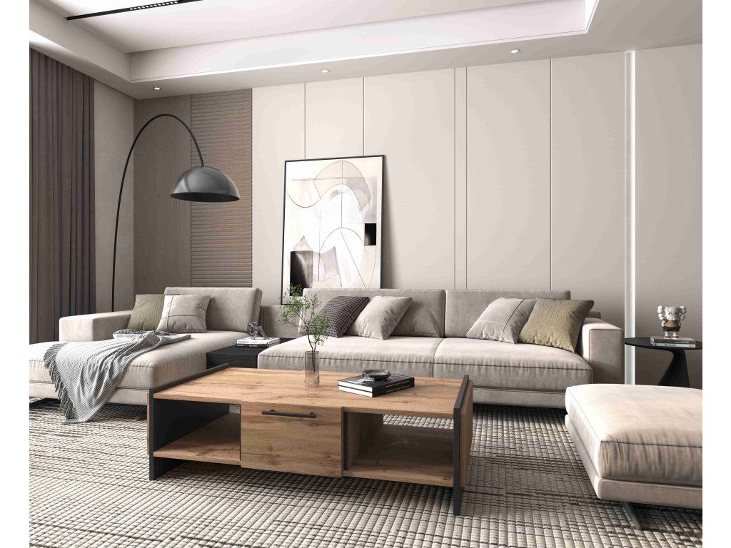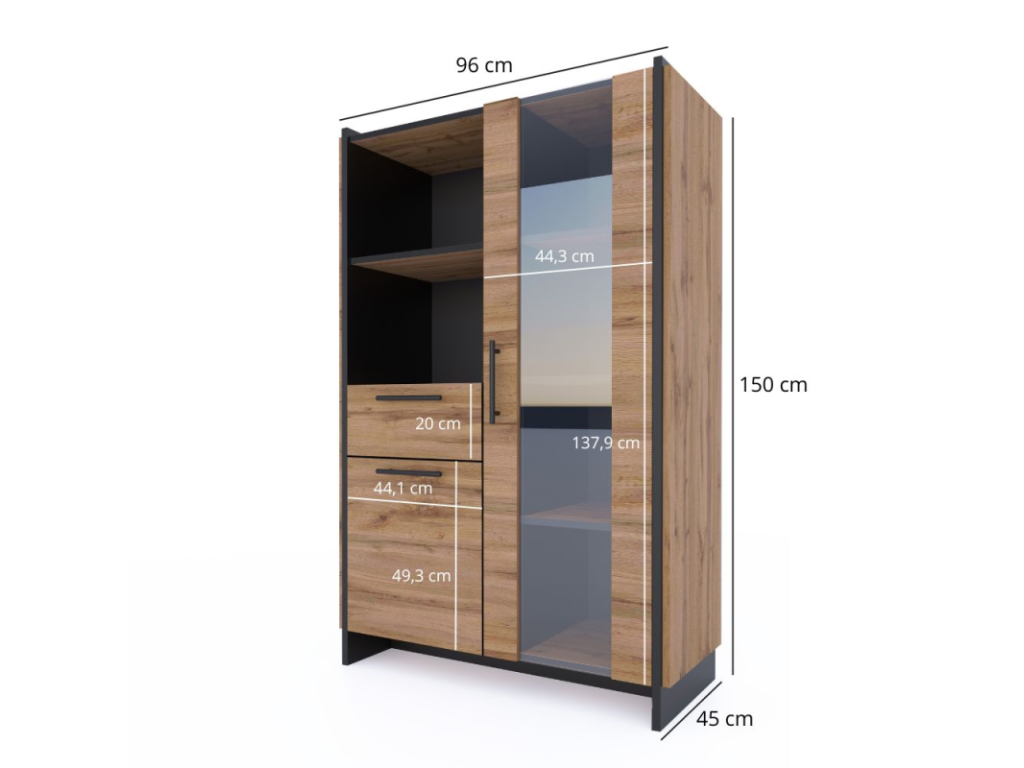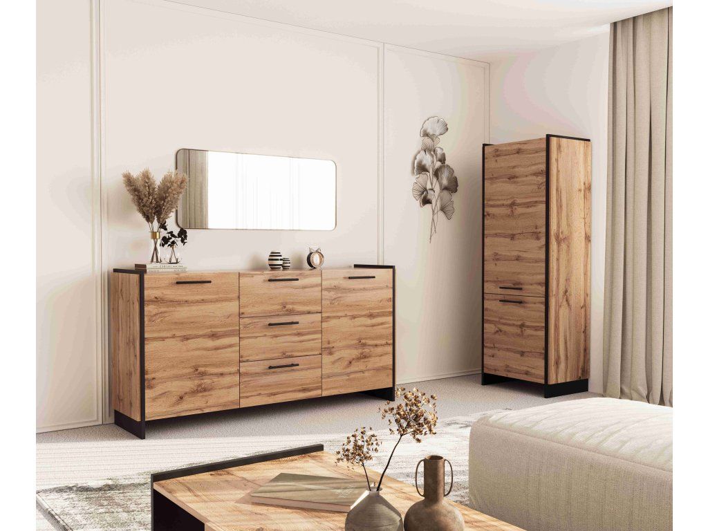 Nábytek z kolekce AMINI je vyroben z kvalitní laminované desky v atraktivní kombinaci dekoru dub Wotan a černé. Hrany jsou opatřeny odolným PVC materiálem, který je chrání před poškozením. Design doplňují elegantní kovové úchytky a stabilní nohy. Pro maximální pohodlí jsou zásuvky vybaveny kuličkovými pojezdy s plným výsuvem, které zajišťují snadný a tichý přístup k celému obsahu.