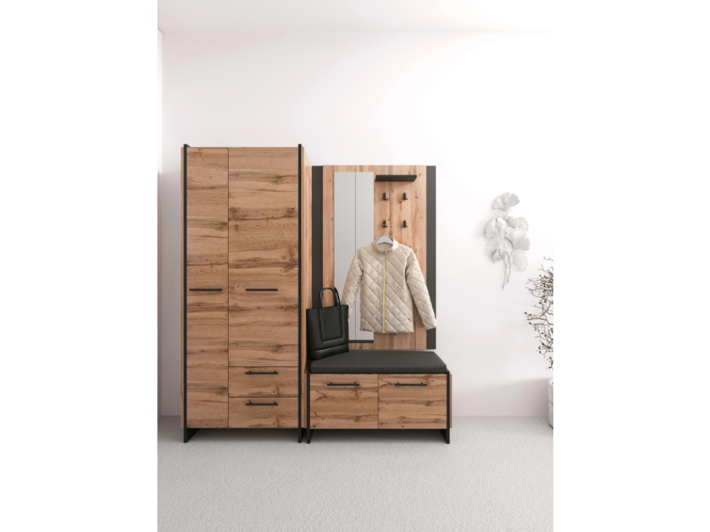 Nábytek z kolekce AMINI je vyroben z kvalitní laminované desky v atraktivní kombinaci dekoru dub Wotan a černé. Hrany jsou opatřeny odolným PVC materiálem, který je chrání před poškozením. Design doplňují elegantní kovové úchytky a stabilní nohy. Pro maximální pohodlí jsou zásuvky vybaveny kuličkovými pojezdy s plným výsuvem, které zajišťují snadný a tichý přístup k celému obsahu.