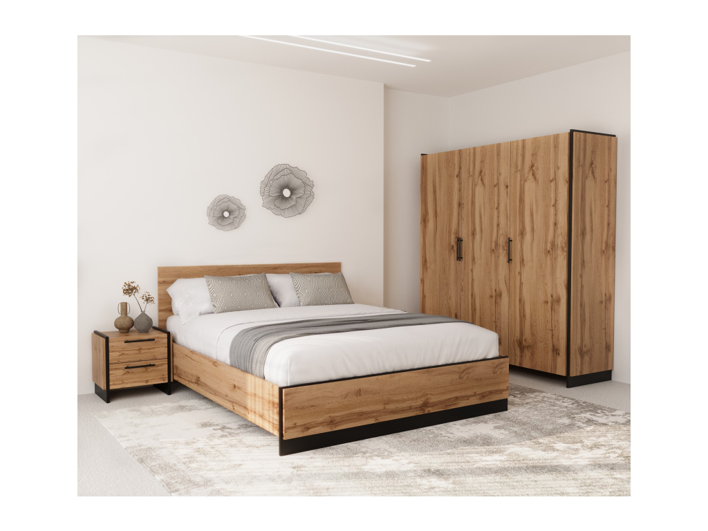 Nábytek z kolekce AMINI je vyroben z kvalitní laminované desky v atraktivní kombinaci dekoru dub Wotan a černé. Hrany jsou opatřeny odolným PVC materiálem, který je chrání před poškozením. Design doplňují elegantní kovové úchytky a stabilní nohy. Pro maximální pohodlí jsou zásuvky vybaveny kuličkovými pojezdy s plným výsuvem, které zajišťují snadný a tichý přístup k celému obsahu. Součástí není matrace a rošt!