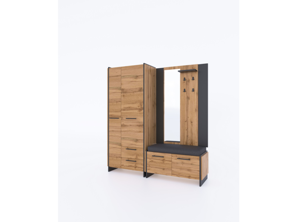 Nábytek z kolekce AMINI je vyroben z kvalitní laminované desky v atraktivní kombinaci dekoru dub Wotan a černé. Hrany jsou opatřeny odolným PVC materiálem, který je chrání před poškozením. Design doplňují elegantní kovové úchytky a stabilní nohy. Pro maximální pohodlí jsou zásuvky vybaveny kuličkovými pojezdy s plným výsuvem, které zajišťují snadný a tichý přístup k celému obsahu.