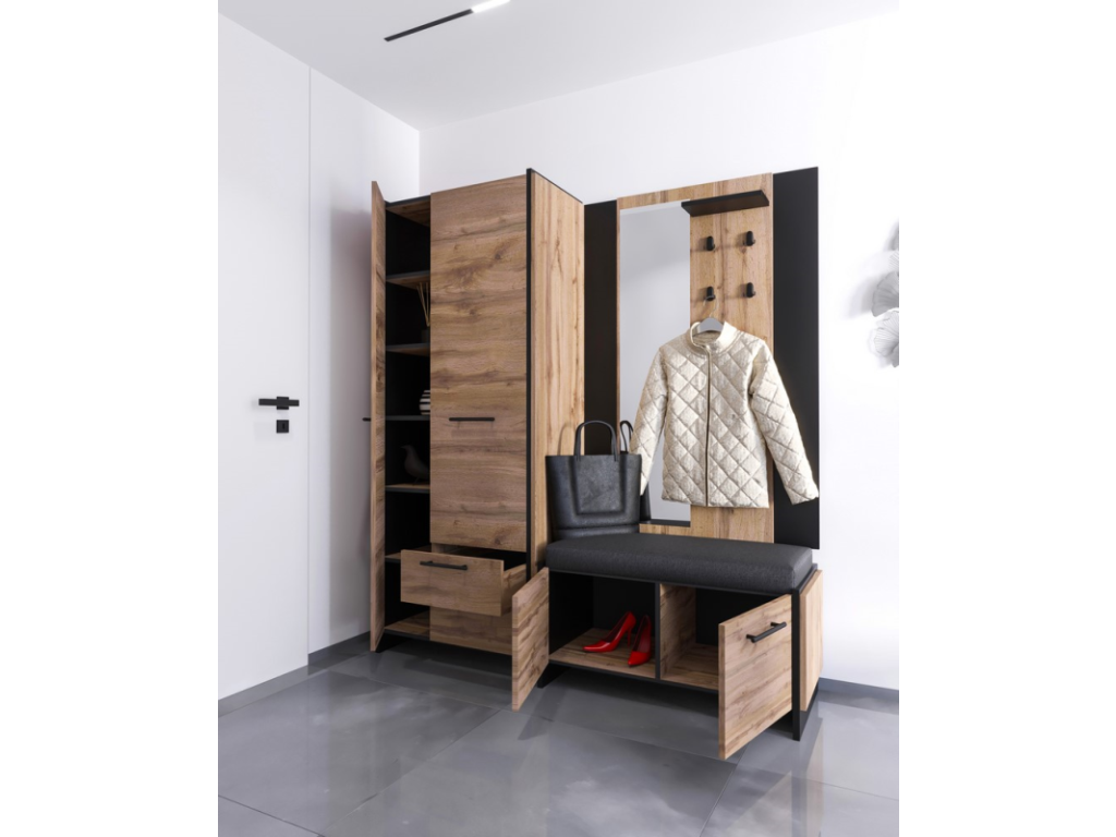 Panel se zrcadlem AMINI je závěsný panel se zrcadlem do předsíně vyrobený z lamino desek v odstínu dub wotan/černá.