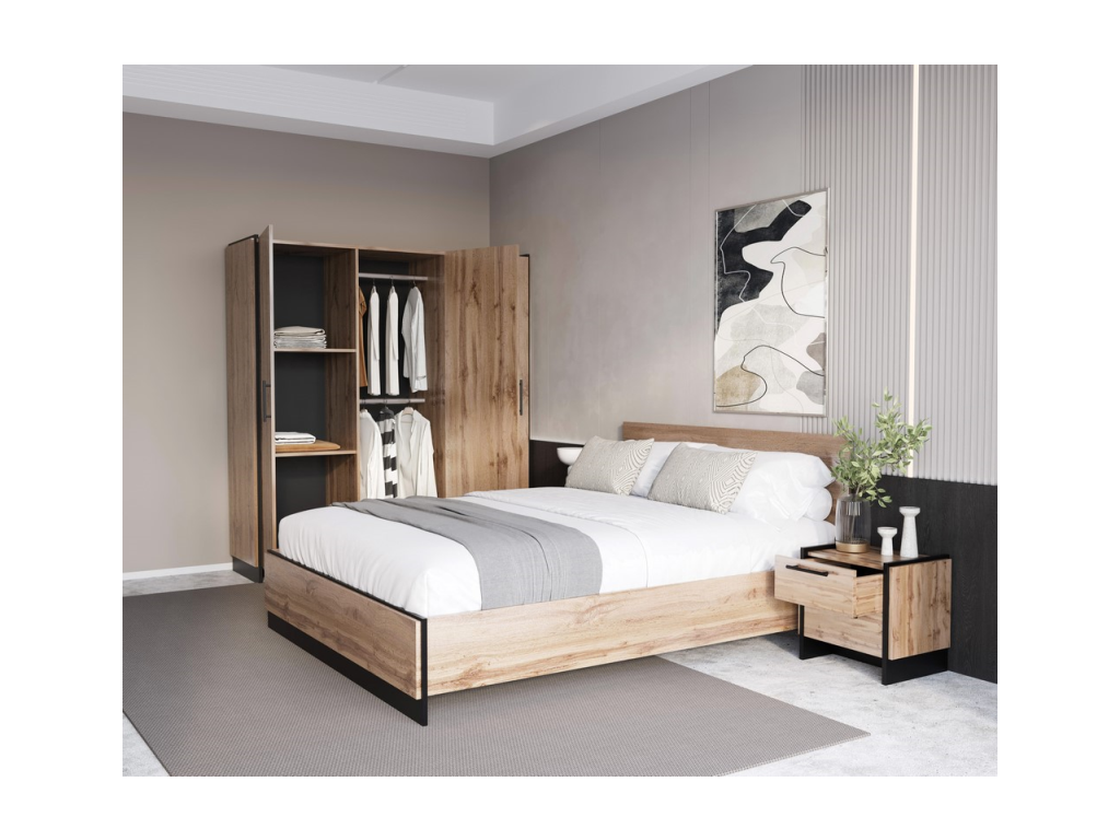 Nábytek z kolekce AMINI je vyroben z kvalitní laminované desky v atraktivní kombinaci dekoru dub Wotan a černé. Hrany jsou opatřeny odolným PVC materiálem, který je chrání před poškozením. Design doplňují elegantní kovové úchytky a stabilní nohy. Pro maximální pohodlí jsou zásuvky vybaveny kuličkovými pojezdy s plným výsuvem, které zajišťují snadný a tichý přístup k celému obsahu.