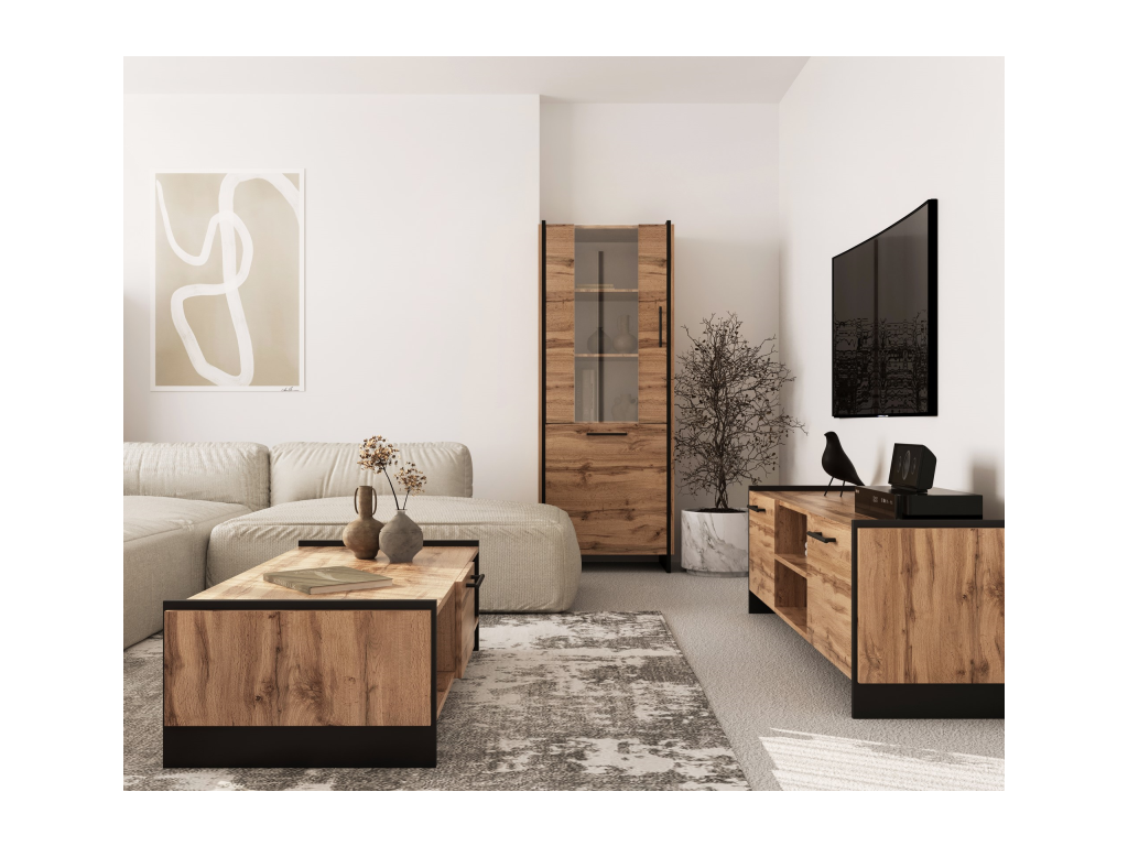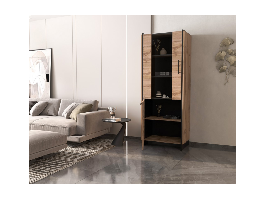 Otevřený regál AMINI je regál do obývacího pokoje vyrobený z lamino desek v odstínu dub wotan/černá.