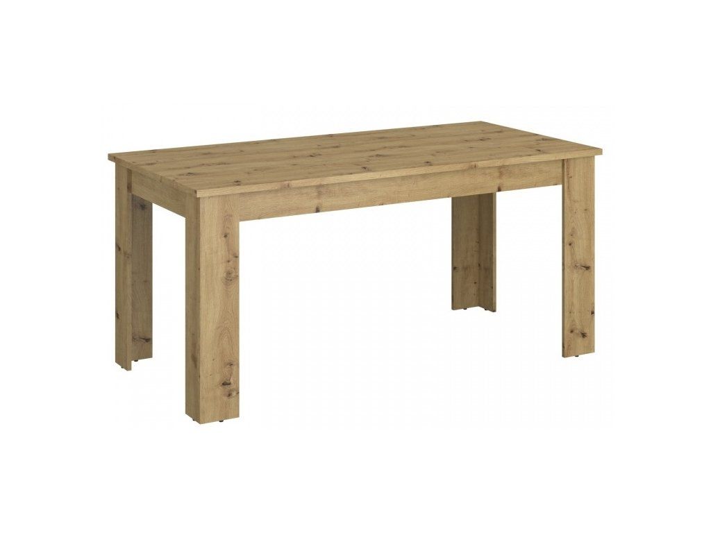 Provedení: Stůl je vyroben v dekoru dub artisan, který je typický svou výraznou kresbou dřeva, viditelnými suky a teplým odstínem. Tento povrch věrně imituje masiv, ale díky laminu je mnohem snazší na údržbu. Charakteristickým prvkem jsou široké, masivní nohy ve tvaru "L" umístěné v rozích, což zajišťuje maximální stabilitu a dostatek prostoru pro nohy stolujících.