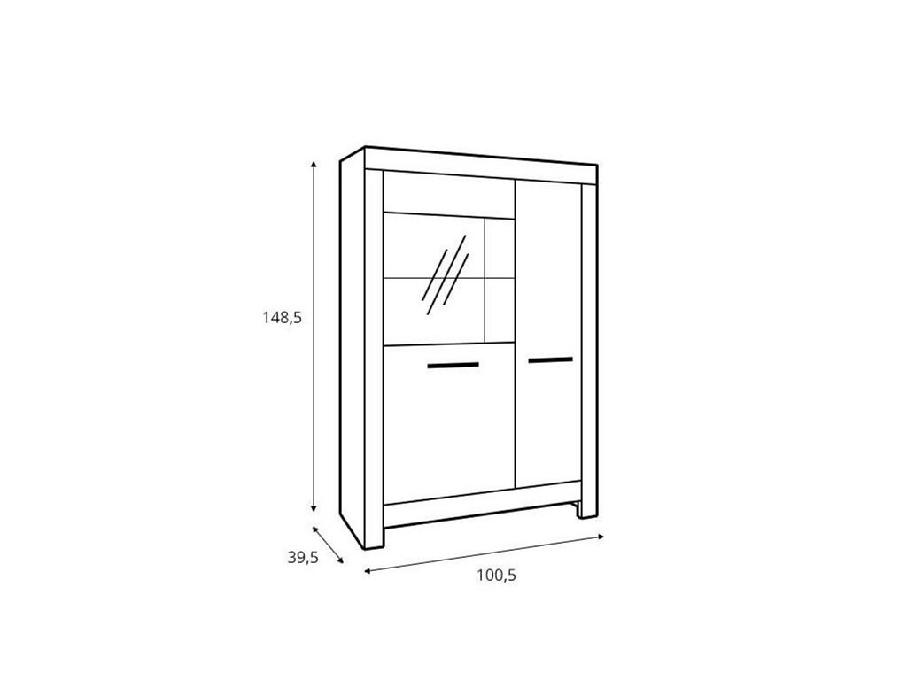 Vitrína je rozdělena na dvě části, část s vitrínou má tři police, z toho jednu skleněnou a v druhé části jsou také tři police.