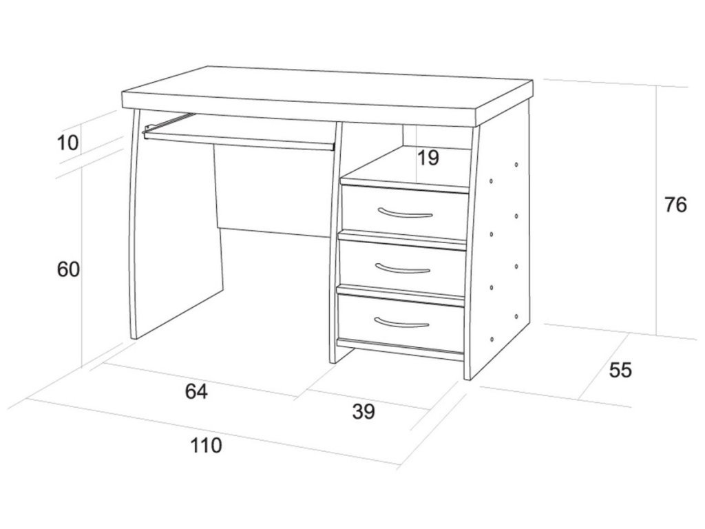 pod pracovní deskou je umístěn výsuv pro klávesnici