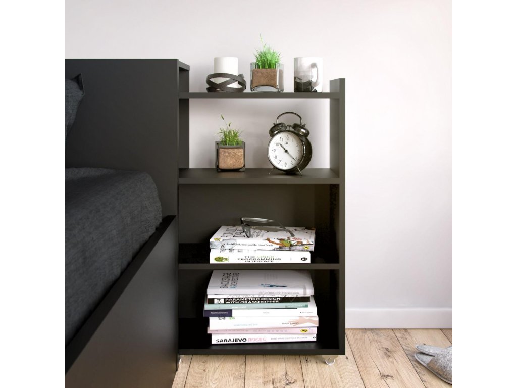 Čelo postele s posuvnými regály síře 140 cm, je skvělým doplňkem k posteli Simplicity 140x200 cm. Se svým skrytým úložným prostorem na knihy, časopisy a všechny další věci, které byste rádi měli po ruce, se stane velmi praktickým a využívaným kusem nábytku. Když jsou regály vysunuté a nahradí Vám noční stolek. Jakmile je zasunete, bude Vaše ložnice stále působit uspořádaně. Pro snadné posunování jsou regály vybaveny kolečky. Čelo je dodáváno v demontu a součástí balení je montážní plánek včetně všech potřebných spojovacích prvků. Vyobrazené dekorace nejsou v ceně.