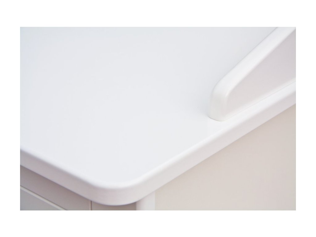 Bílá přebalovací komoda je vyrobena z bukového dřeva, laminátu a MDF. Přebalovací pult je možné oddělit. Komoda obsahuje 3 prostorné šuplíky. Komoda je velmi robustní, proto není třeba dalšího jištění proti převrácení.