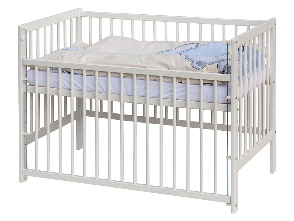 1. Dětská dřevěná postýlka 120 x 60 cm - bílá, masiv borovice, stahovací bok, 6 poloh roštu