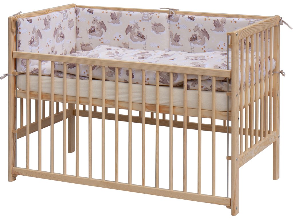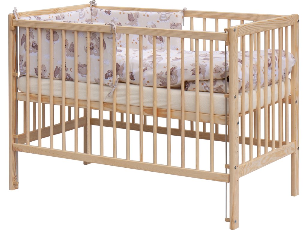 1. Dětská dřevěná postýlka 120 x 60 cm, masiv borovice, stahovací bok, 6 poloh roštu