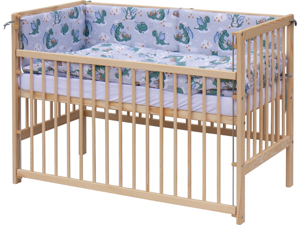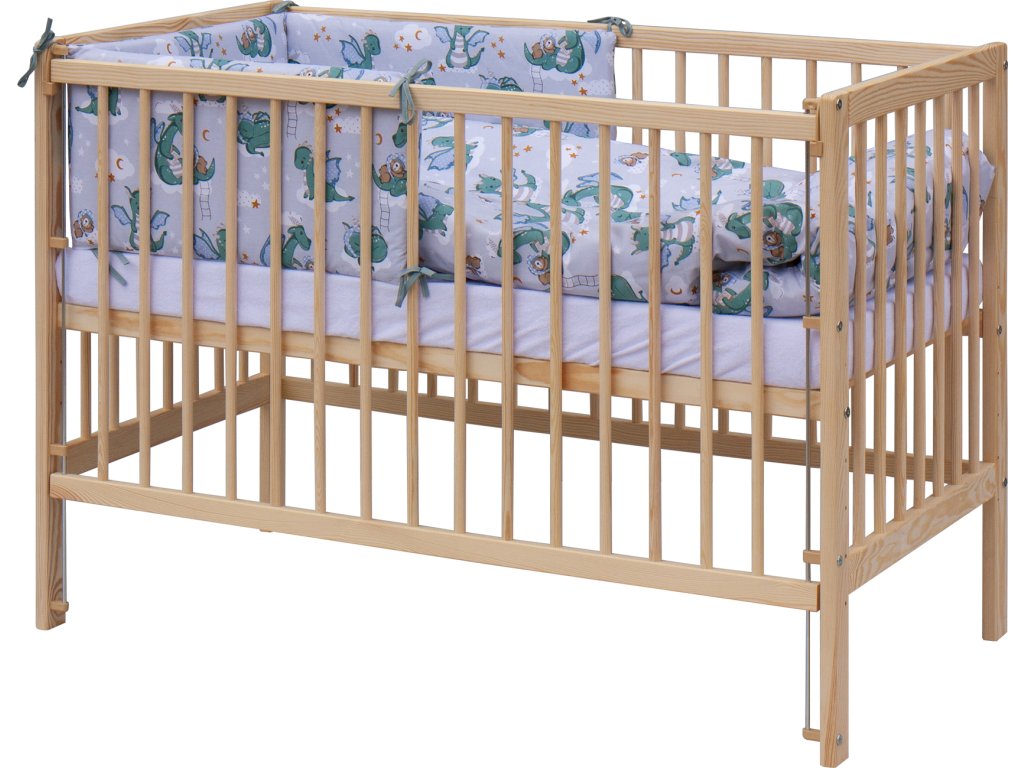 1. Dětská dřevěná postýlka 120 x 60 cm, masiv borovice, stahovací bok, 6 poloh roštu
