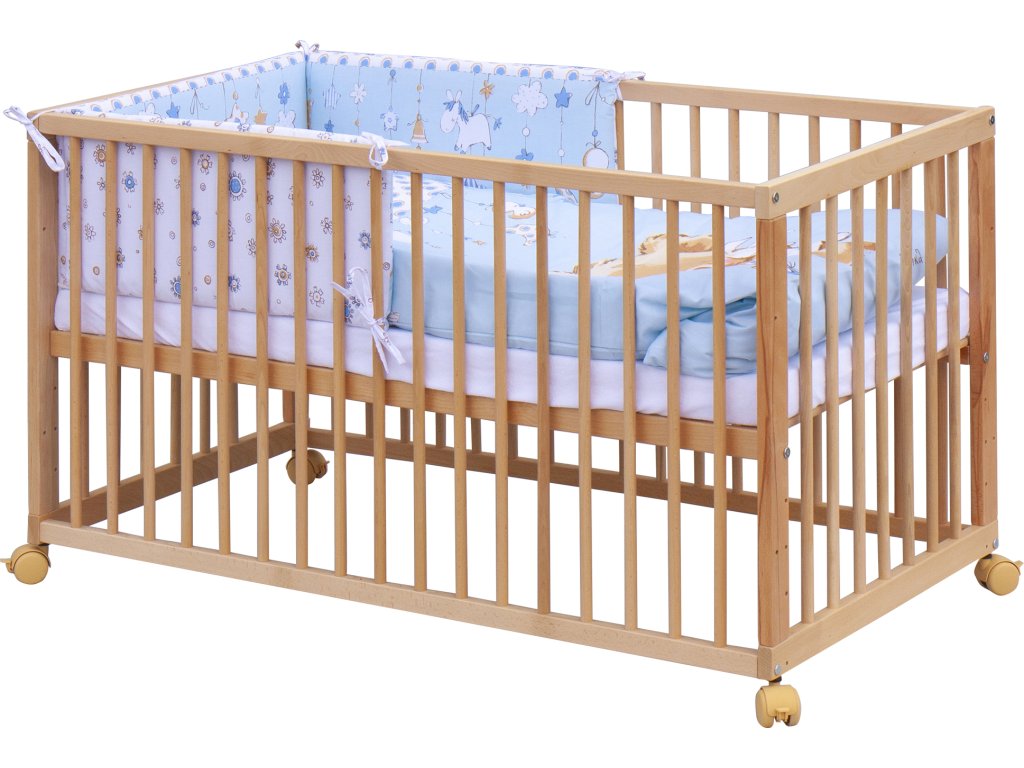 1. Dětská dřevěná postýlka 120 x 60 cm - přírodní, masiv buk, 3 vyndavací příčky, 5 poloh roštu, nohy postýlky jsou předvrtané pro nasazení koleček