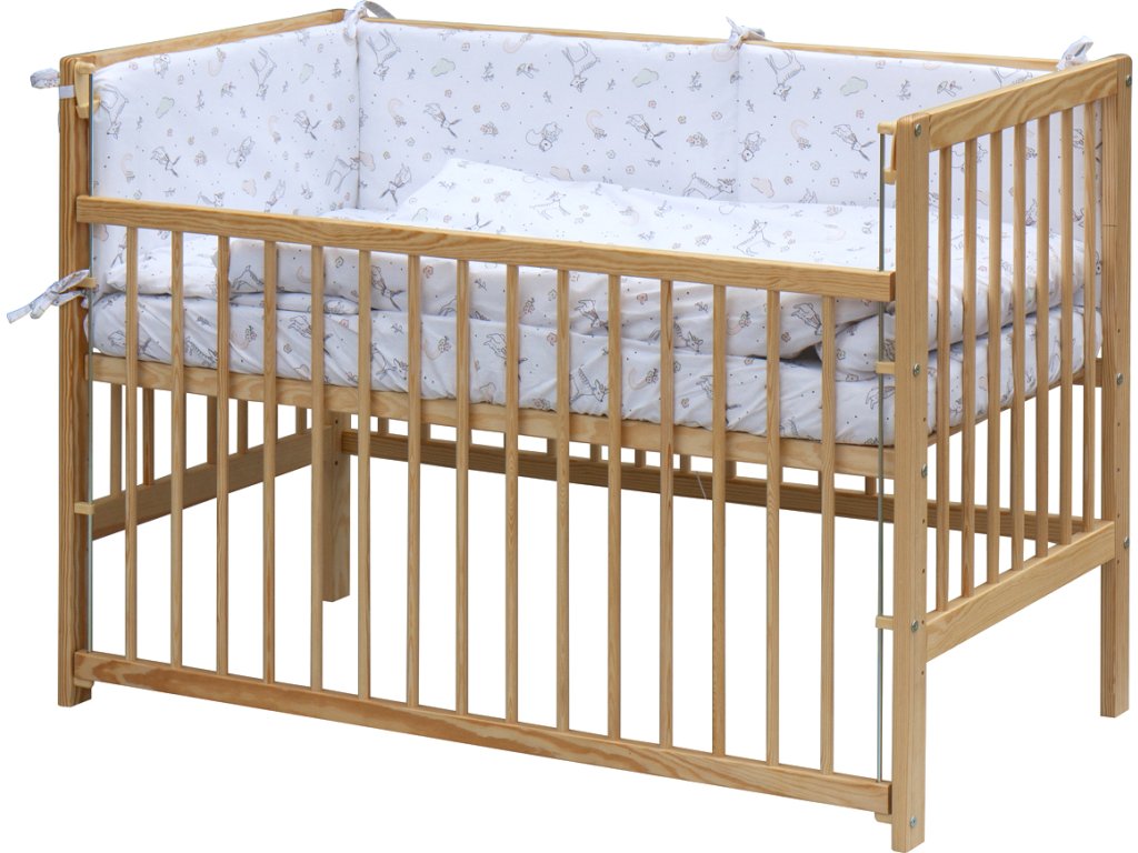 1. Dětská dřevěná postýlka 120 x 60 cm - přírodní, masiv borovice, stahovací bok, 6 poloh roštu