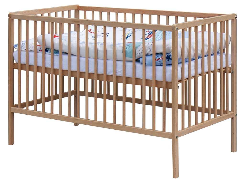 1. Dětská dřevěná postýlka 120 x 60 cm - přírodní, masiv borovice, 3 vyndavací příčky, 3 polohy roštu,