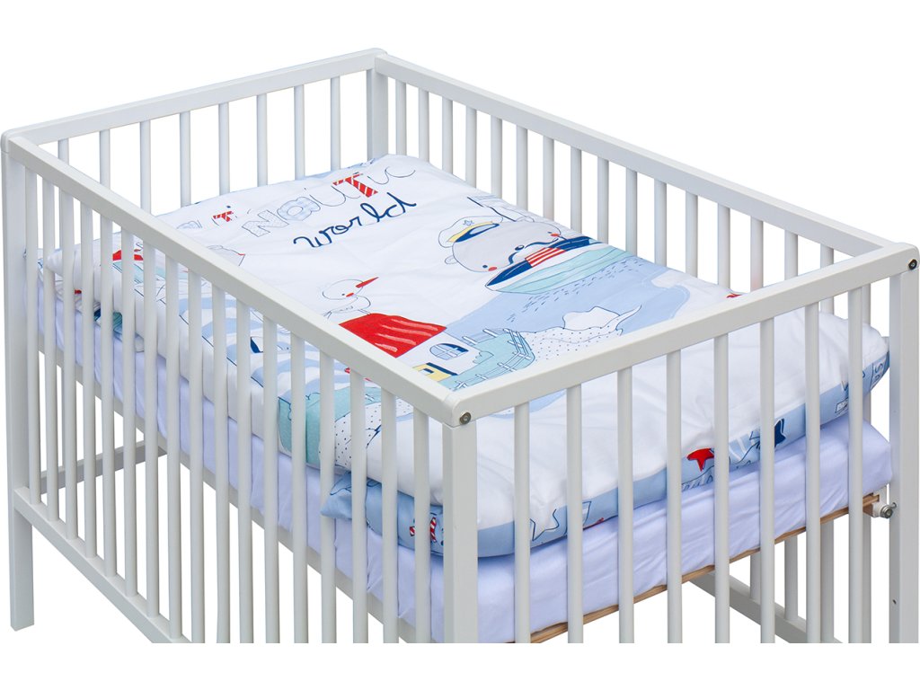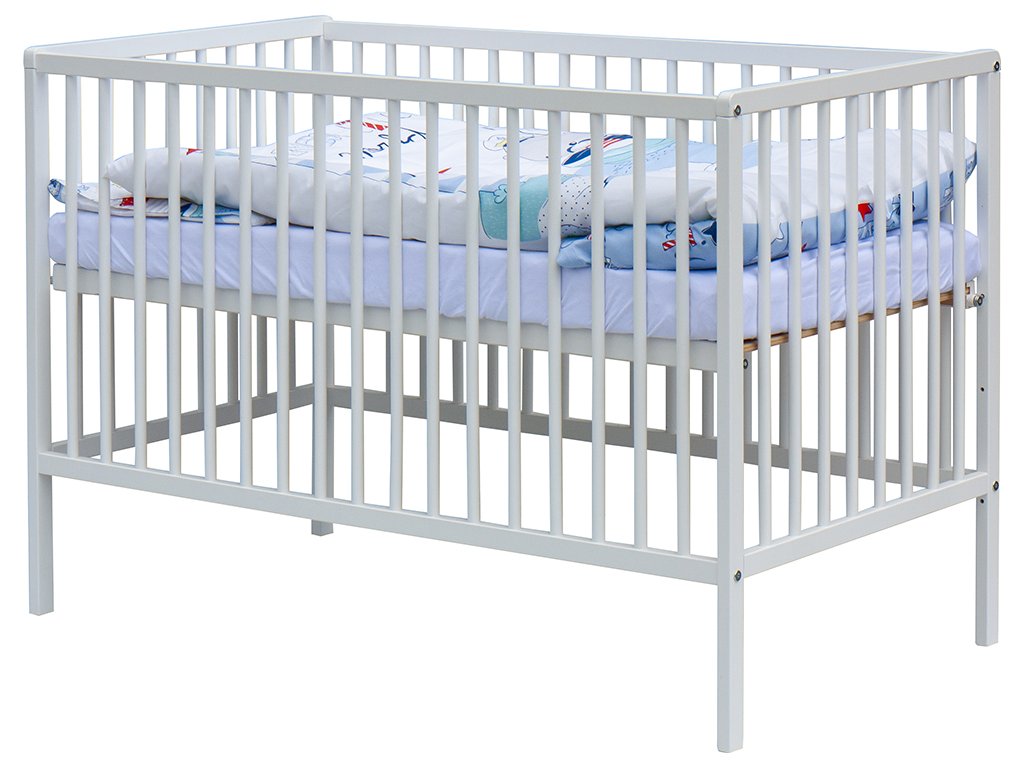1. Dětská dřevěná postýlka 120x60 cm - bílá, masiv buk, 3 vyndavací příčky, 3 polohy roštu
