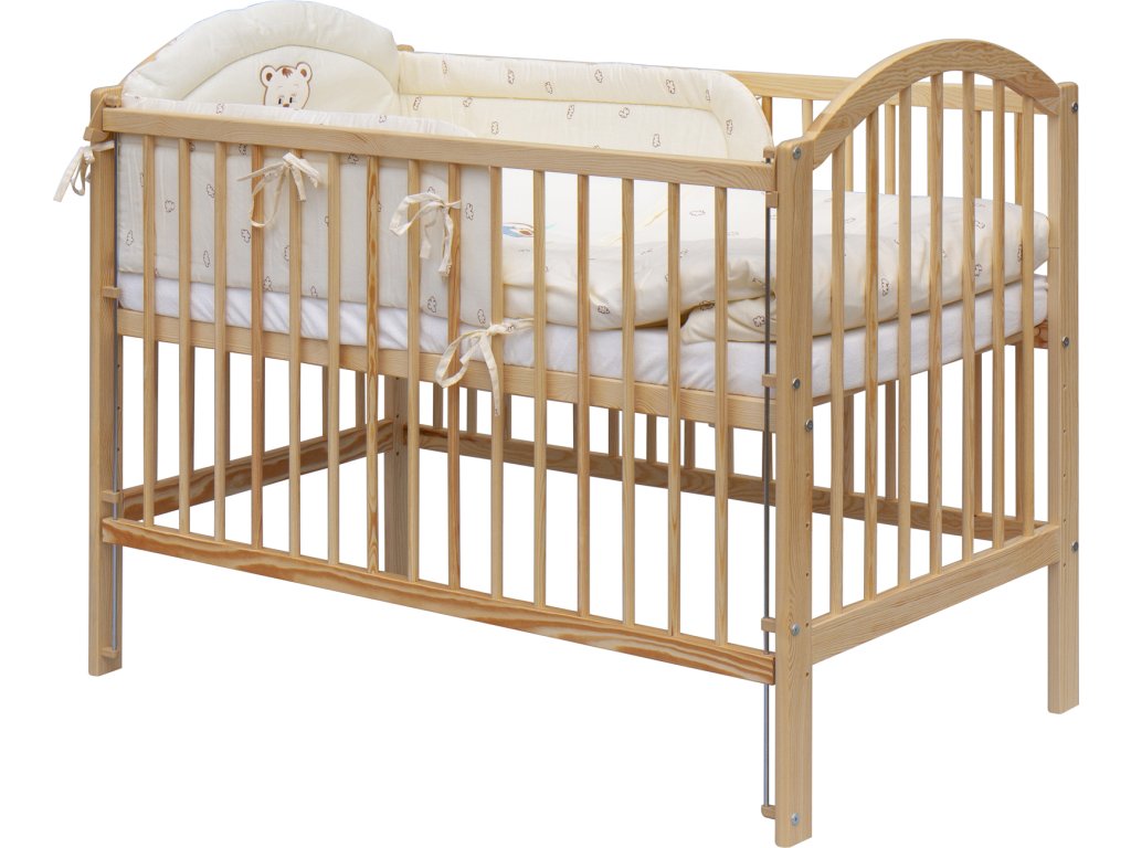 1. Dětská dřevěná postýlka 120 x 60 cm - přírodní, masiv borovice, stahovací bok, 6 poloh roštu