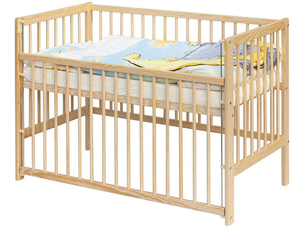 1. Dětská dřevěná postýlka 120 x 60 cm - přírodní, masiv borovice, stahovací bok, 6 poloh roštu