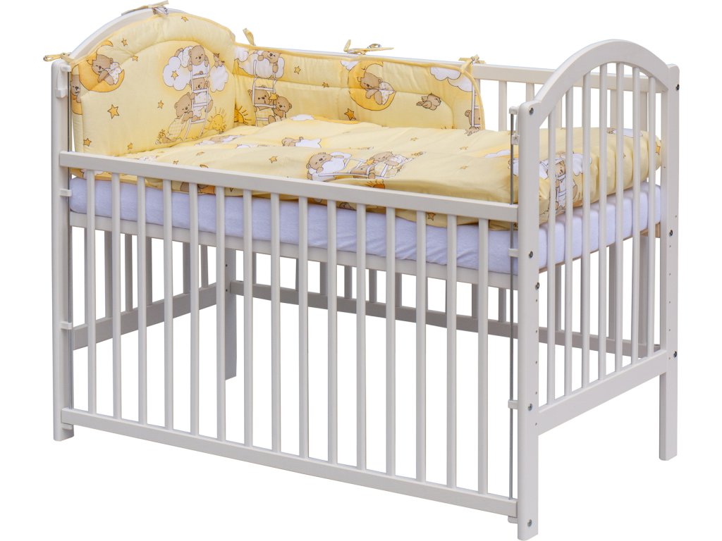 1. Dětská dřevěná postýlka 120 x 60 cm - bílá, masiv borovice, stahovací bok, 6 poloh roštu, nohy postýlky jsou předvrtané pro nasazení koleček