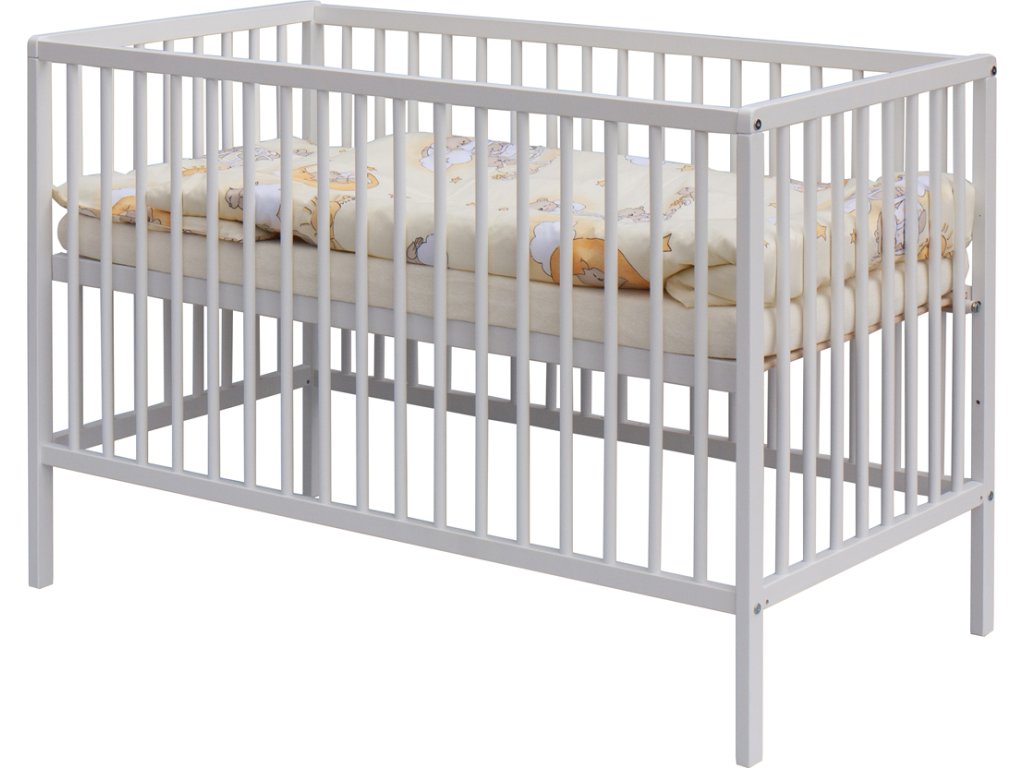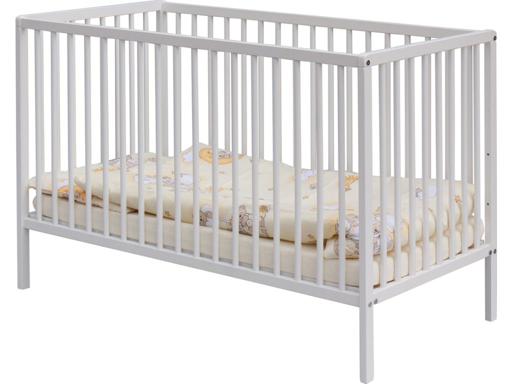 1. Dětská dřevěná postýlka 120 x 60 cm - bílá, masiv buk, 3 vyndavací příčky, 2 polohy roštu