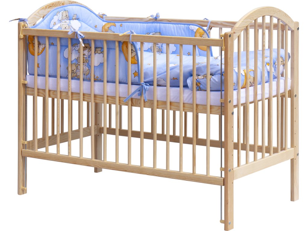 1. Dětská dřevěná postýlka 120 x 60 cm - přírodní, masiv borovice, stahovací bok, 6 poloh roštu