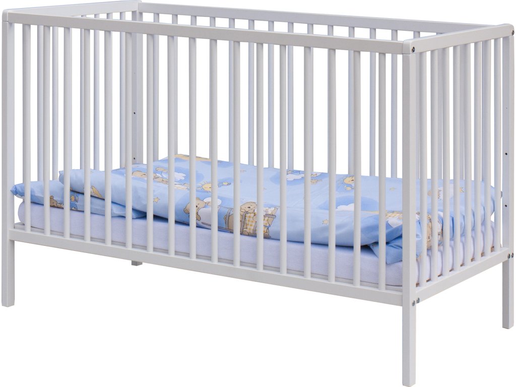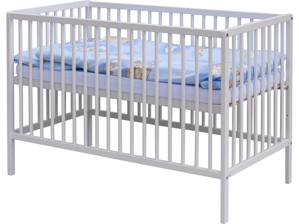 1. Dětská dřevěná postýlka 120 x 60 cm - bílá, masiv buk, 3 vyndavací příčky, 2 polohy roštu