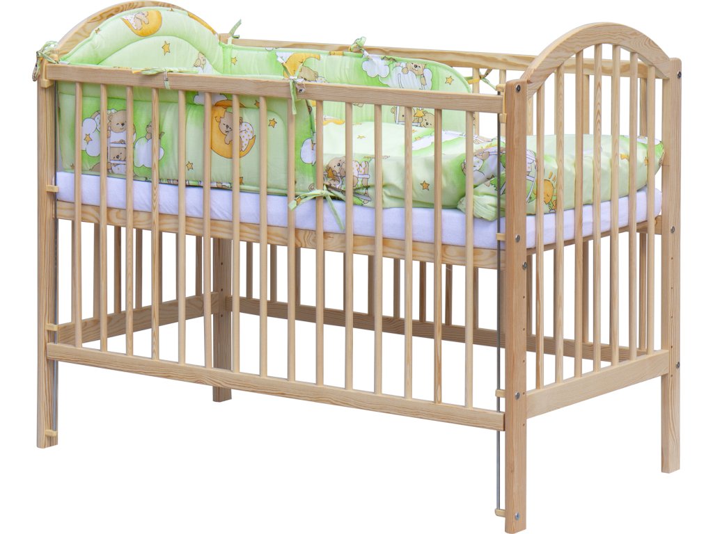 1. Dětská dřevěná postýlka 120 x 60 cm - přírodní, masiv borovice, stahovací bok, 6 poloh roštu