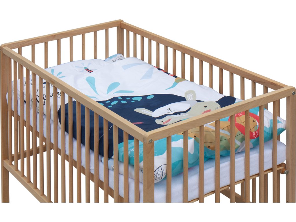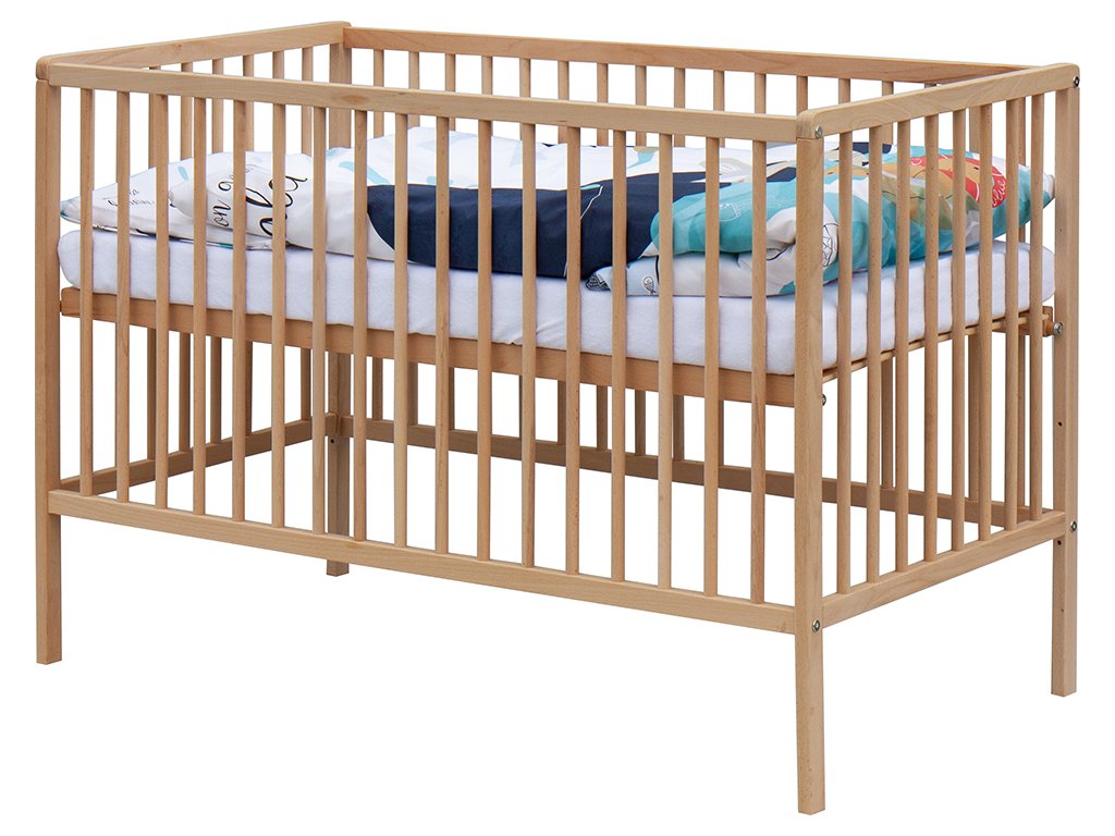 1. Dětská dřevěná postýlka 120 x 60 cm - přírodní, masiv borovice, 3 vyndavací příčky, 3 polohy roštu,