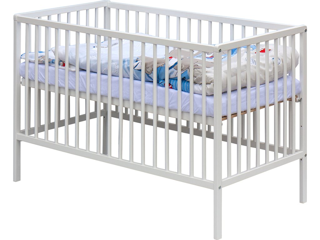 1. Dětská dřevěná postýlka 120x60 cm - bílá, masiv buk, 3 vyndavací příčky, 3 polohy roštu