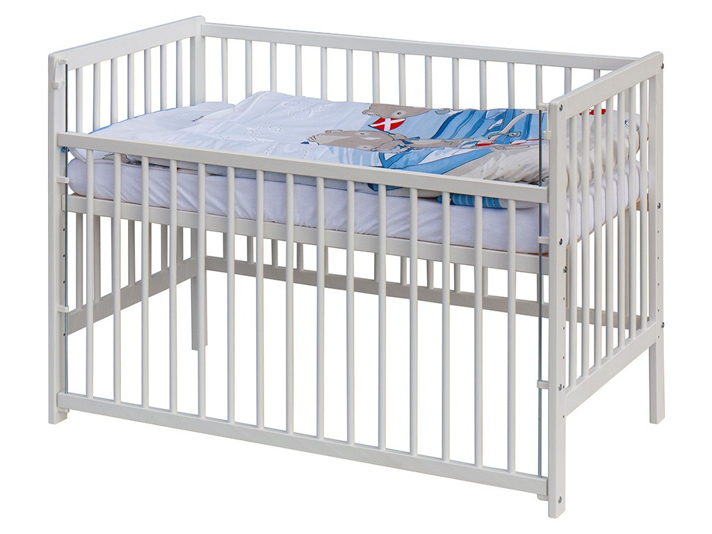 1. Dětská dřevěná postýlka 120 x 60 cm - bílá, masiv borovice, stahovací bok, 6 poloh roštu