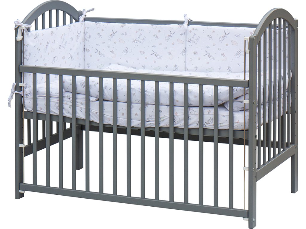 1. Dětská dřevěná postýlka 120 x 60 cm - šedá, masiv borovice, stahovací bok, 6 poloh roštu, nohy postýlky jsou předvrtané pro případné nasazení koleček