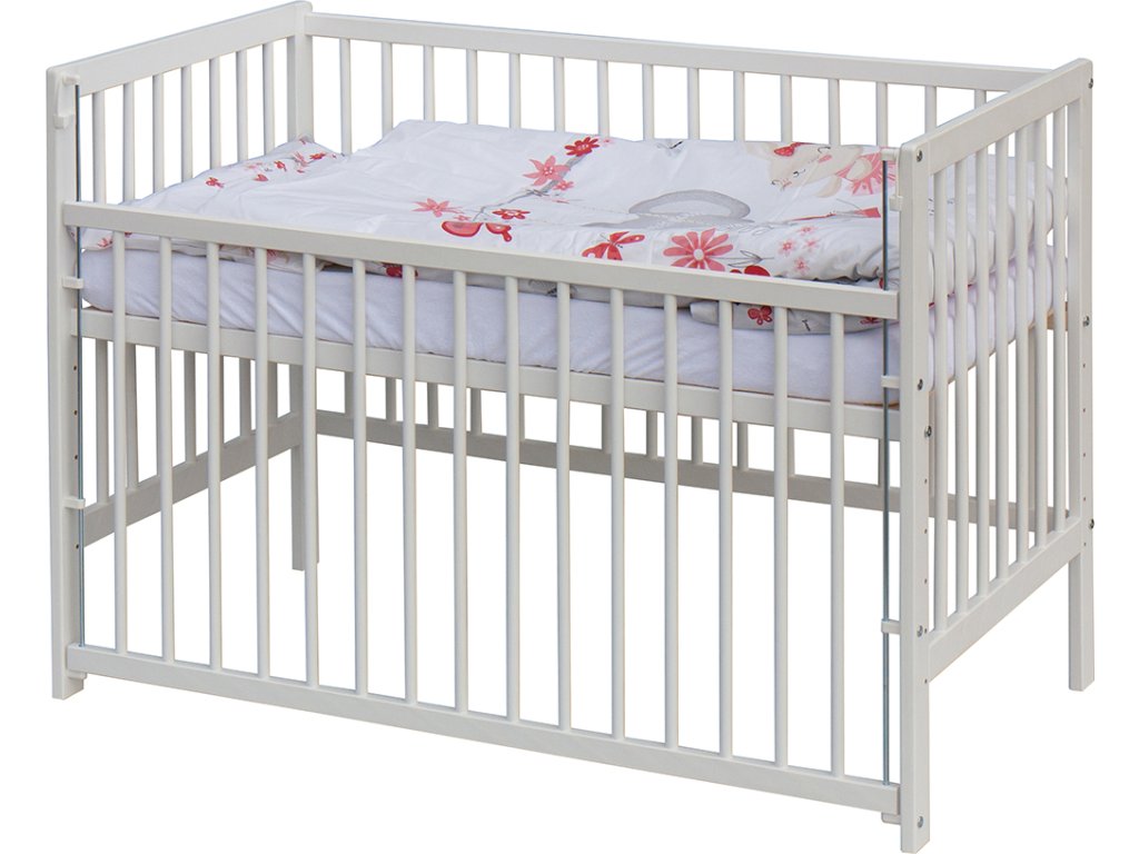 1. Dětská dřevěná postýlka 120 x 60 cm - bílá, masiv borovice, stahovací bok, 6 poloh roštu