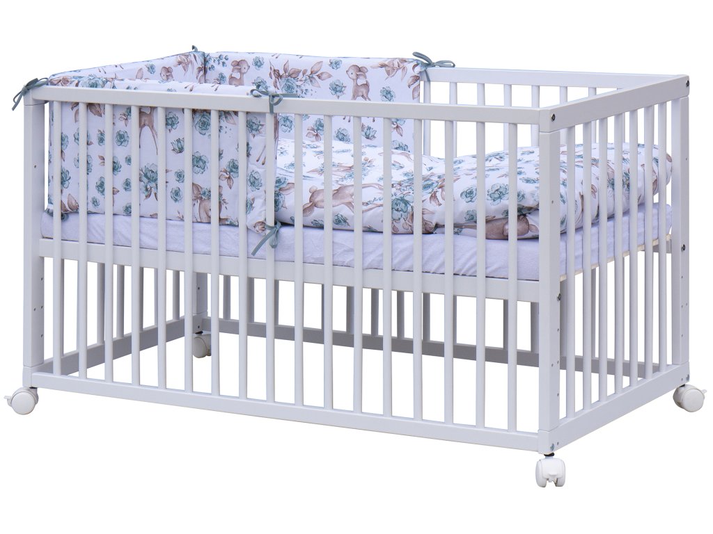 1. Dětská dřevěná postýlka 120x60 cm - bílá, masiv buk, 3-vyndavací příčky, 5-poloh roštu, noho předvrtané pro kolečka