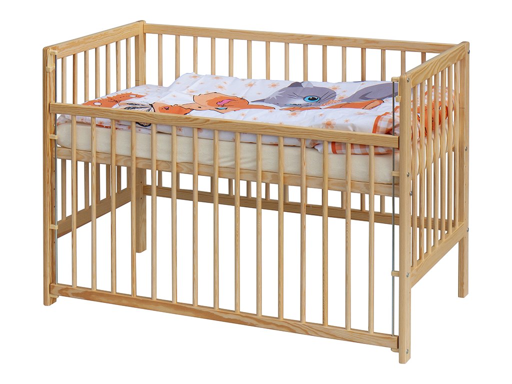 1. Dětská dřevěná postýlka 120 x 60 cm - přírodní, masiv borovice, stahovací bok, 6 poloh roštu
