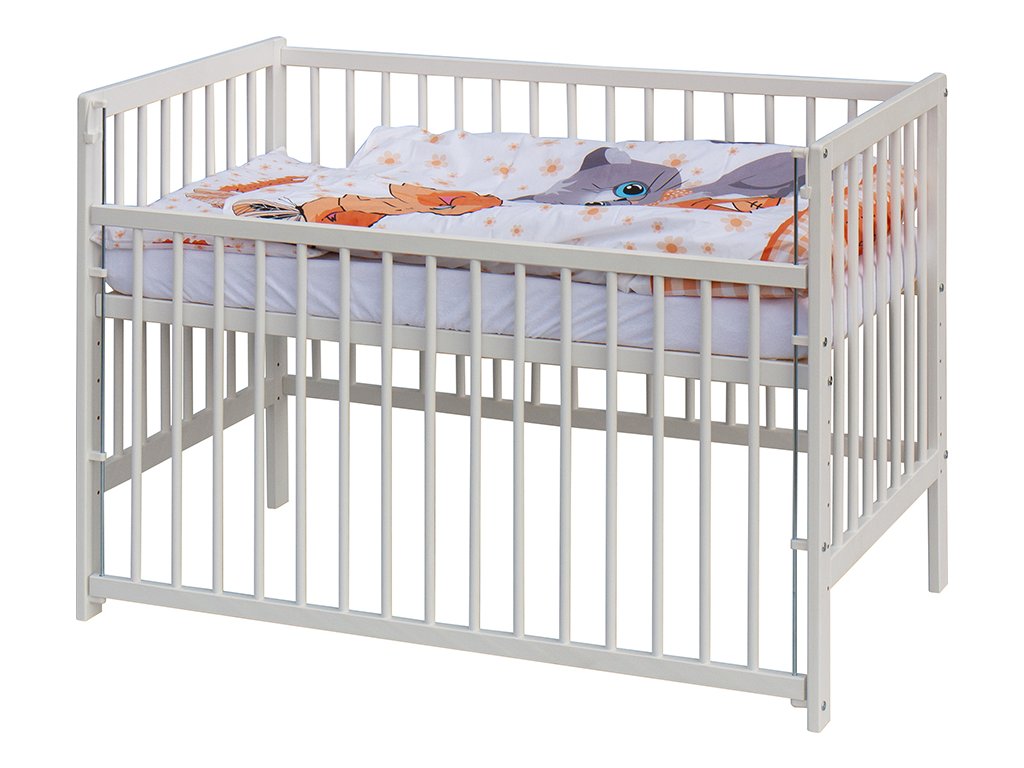 1. Dětská dřevěná postýlka 120 x 60 cm - bílá, masiv borovice, stahovací bok, 6 poloh roštu