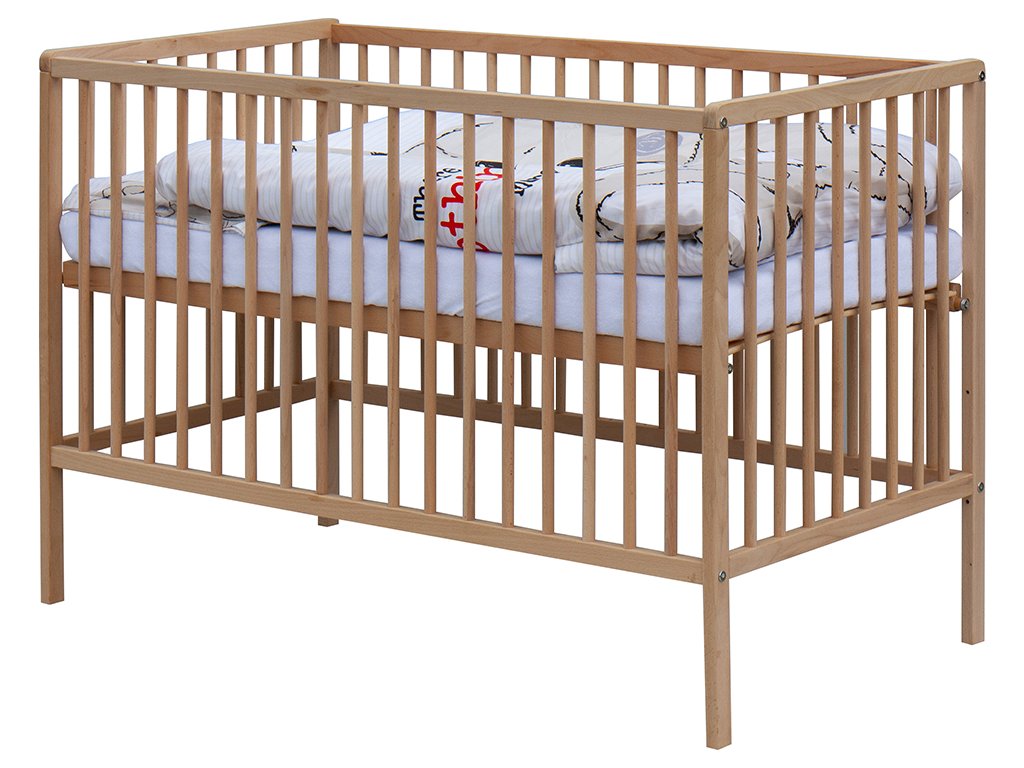 1. Dětská dřevěná postýlka 120 x 60 cm - přírodní, masiv borovice, 3 vyndavací příčky, 3 polohy roštu,
