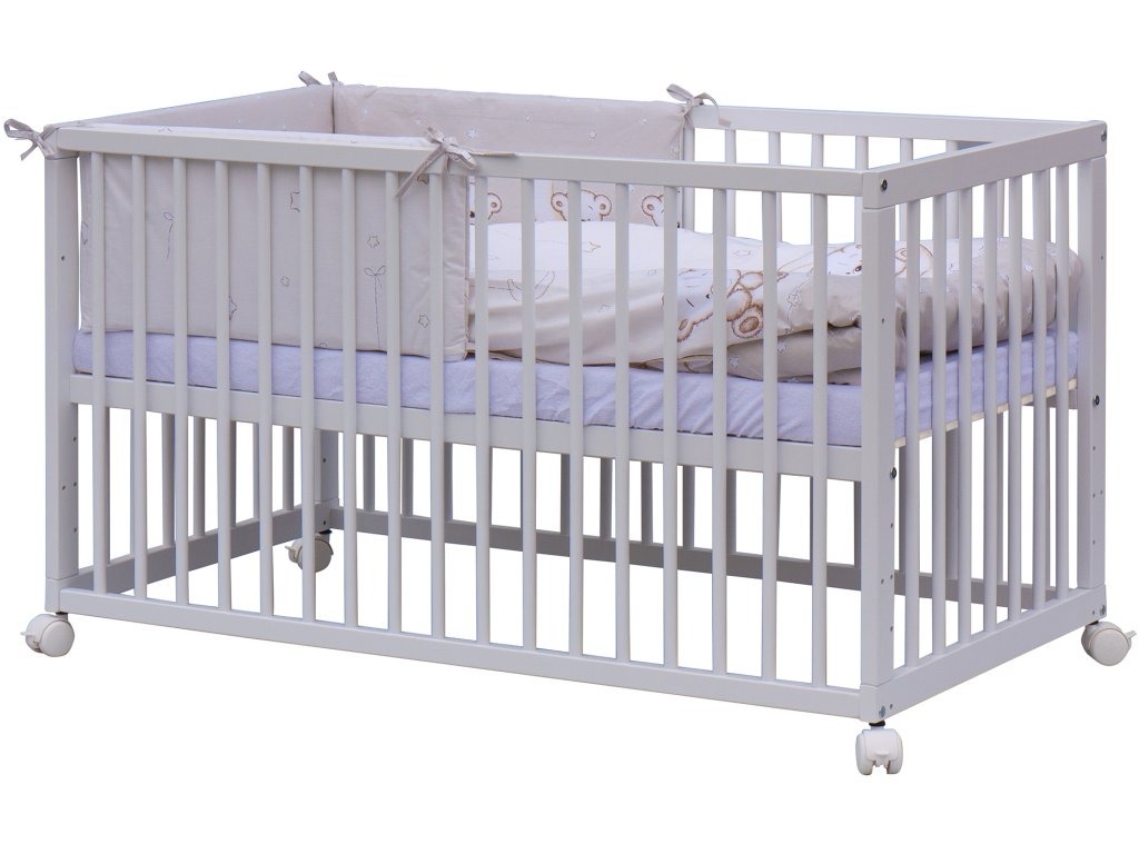 1. Dětská dřevěná postýlka 120x60 cm - bílá, masiv buk, 3-vyndavací příčky, 5-poloh roštu, noho předvrtané pro kolečka