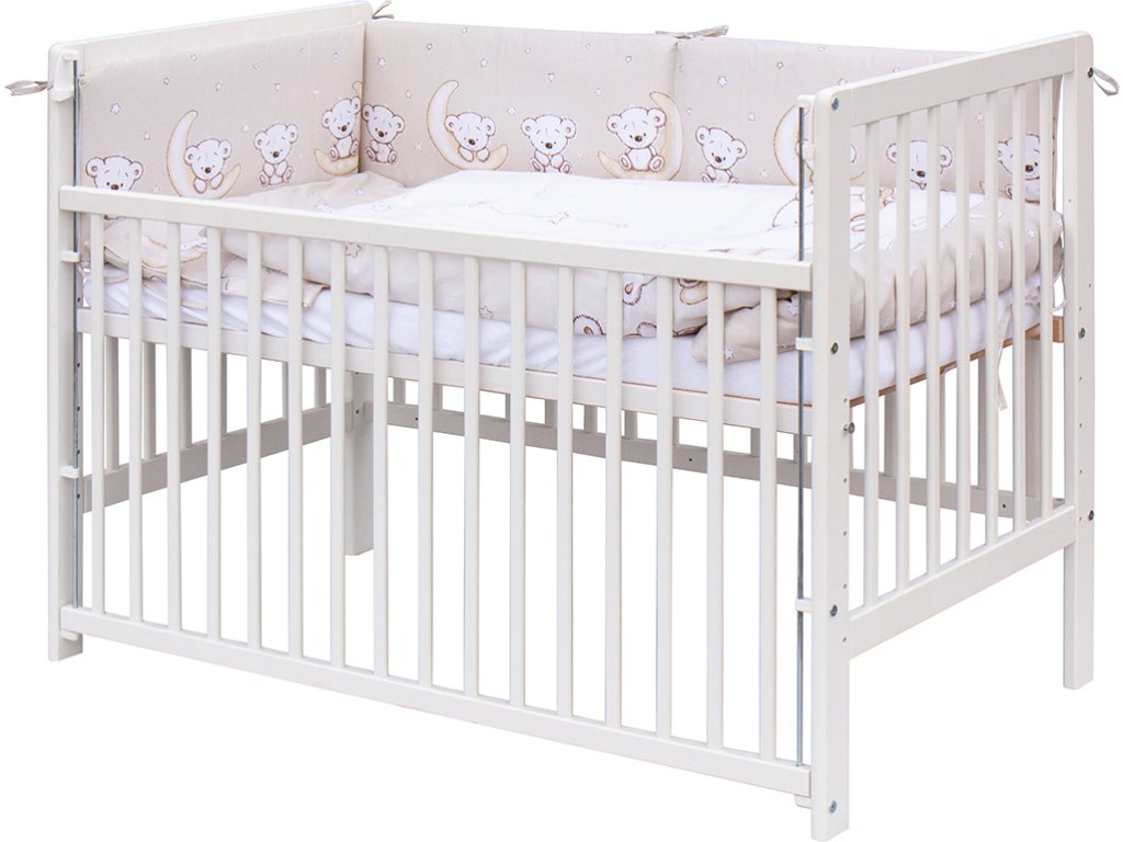 1. Dětská dřevěná postýlka 120 x 60 cm - bílá, masiv borovice, stahovací bok, 6 poloh roštu