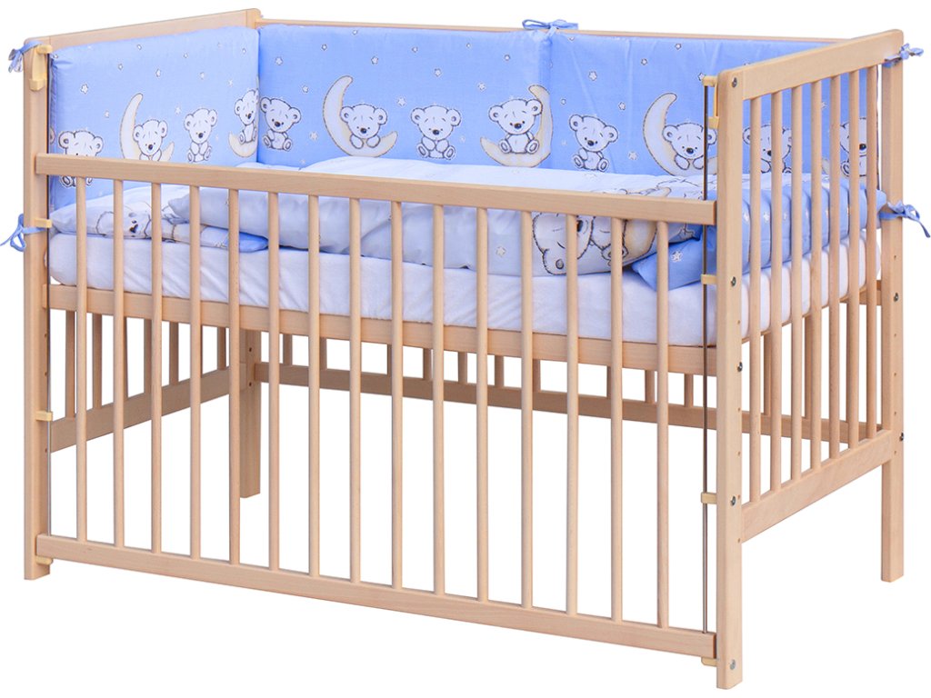 1. Dětská dřevěná postýlka 120 x 60 cm - přírodní, masiv borovice, stahovací bok, 6 poloh roštu