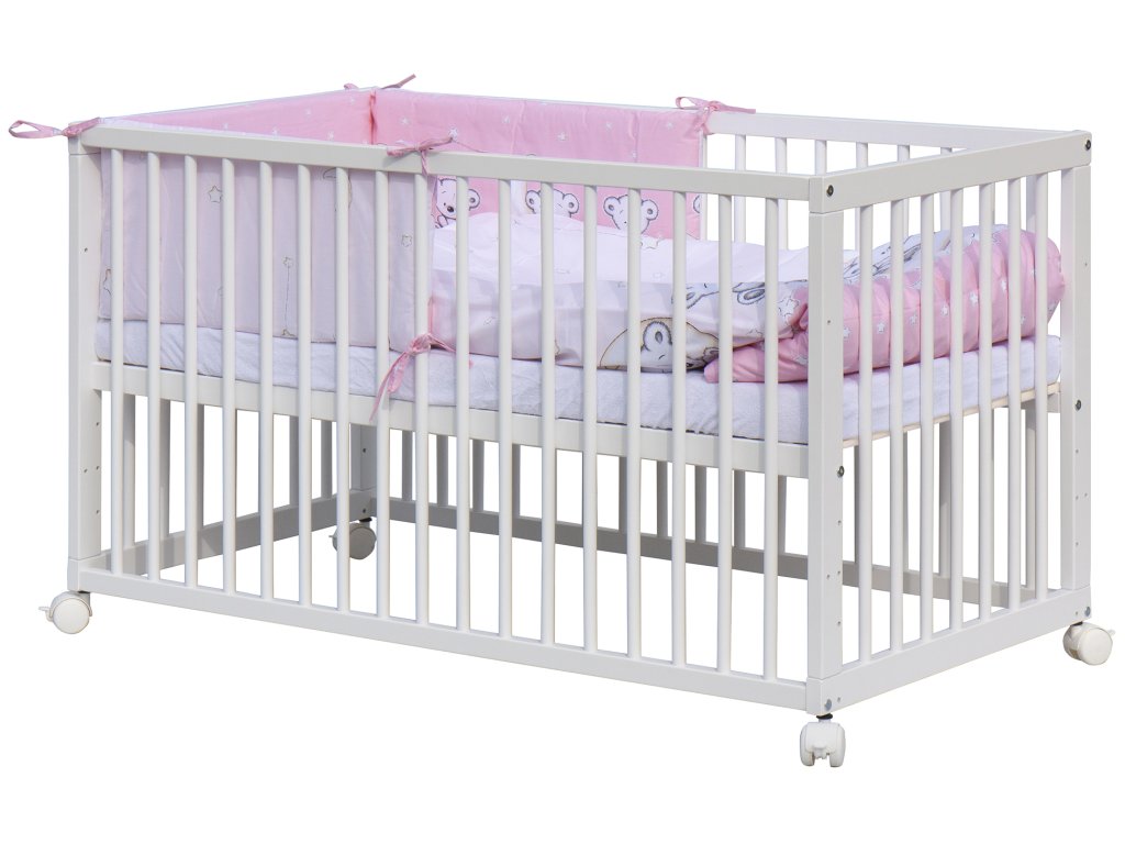 1. Dětská dřevěná postýlka 120x60 cm - bílá, masiv buk, 3-vyndavací příčky, 5-poloh roštu, noho předvrtané pro kolečka