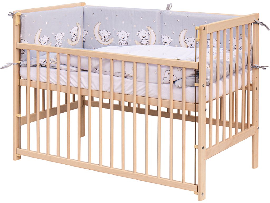 1. Dětská dřevěná postýlka 120 x 60 cm - přírodní, masiv borovice, stahovací bok, 6 poloh roštu