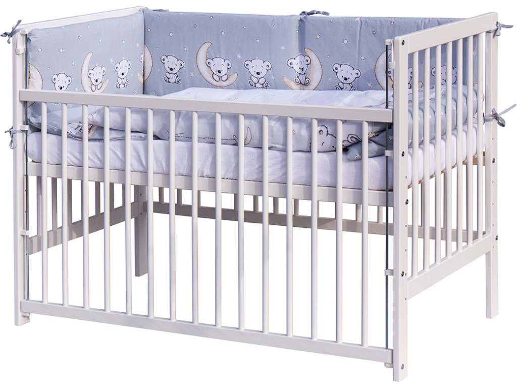 1. Dětská dřevěná postýlka 120 x 60 cm - bílá, masiv buk, stahovací bok, 6 poloh roštu