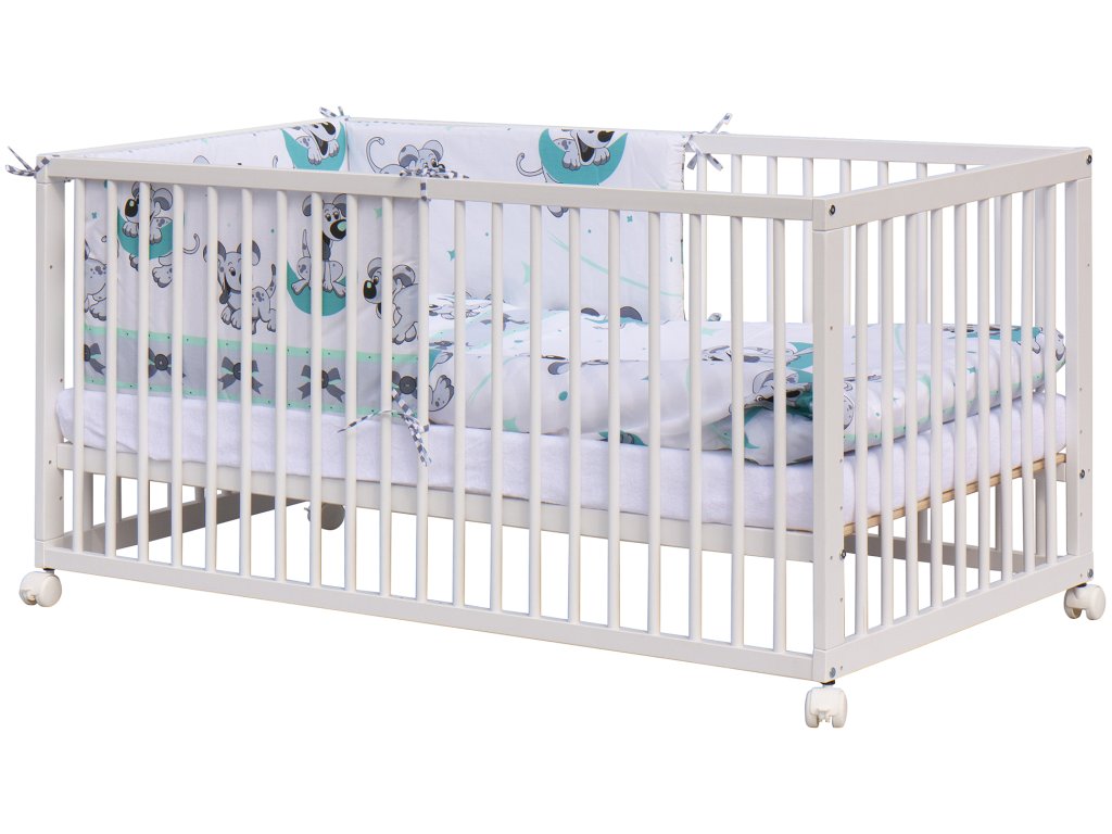 1. Dětská dřevěná postýlka 140x70 cm - bílá, masiv buk, 3 vyndavací příčky, 5-poloh roštu, nohy postýlky jsou předvrtána pro kolečka