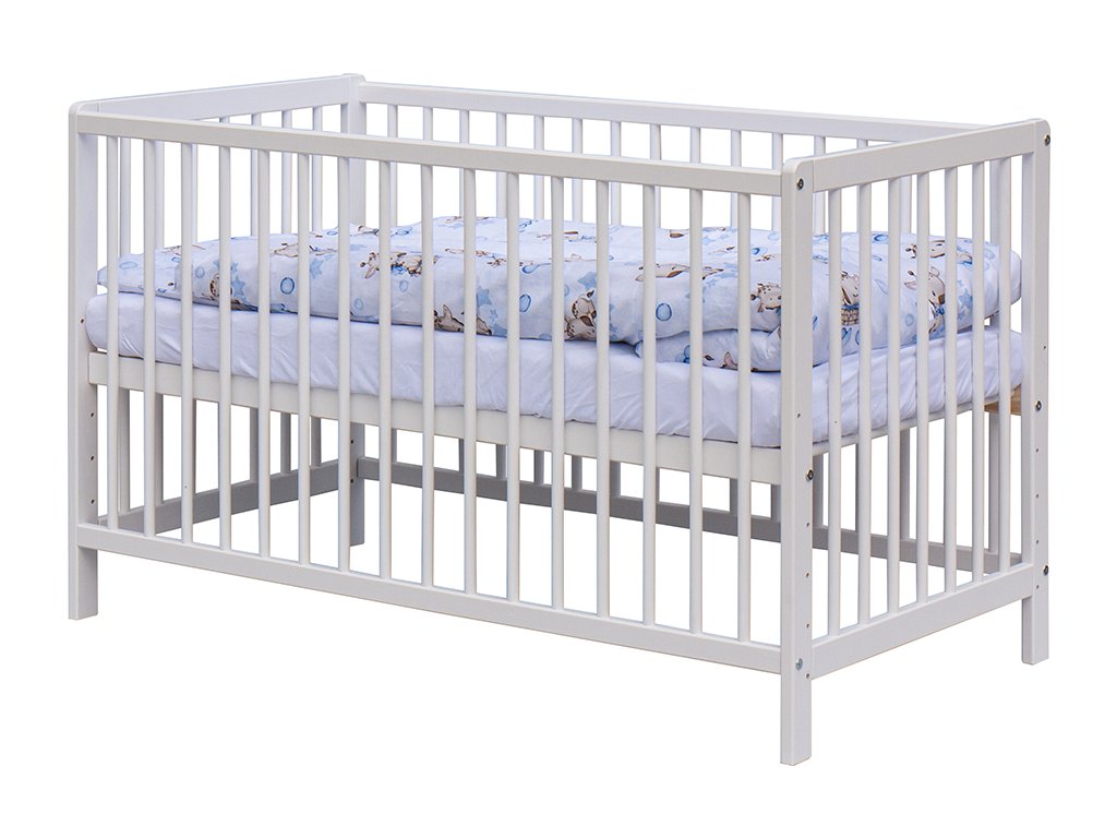 1. Dětská dřevěná postýlka 120x60 cm - bílá, masiv borovice, 3 vyndavací příčky, 5 poloh roštu