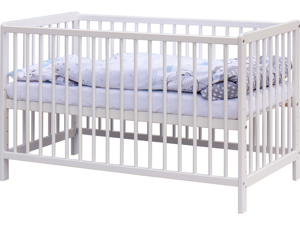 1. Dětská dřevěná postýlka 120x60 cm - bílá, masiv borovice, 3 vyndavací příčky, 5 poloh roštu