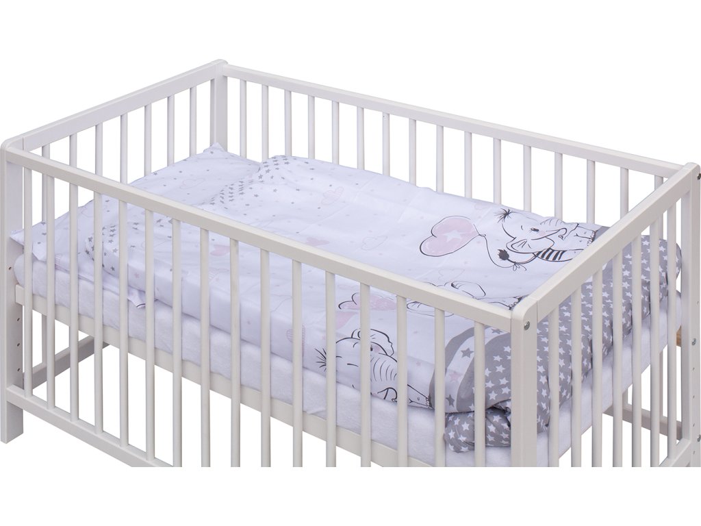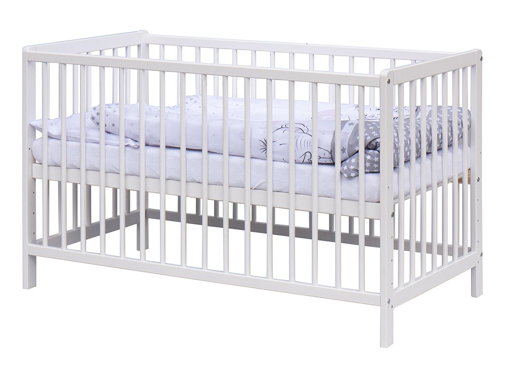 1. Dětská dřevěná postýlka 120x60 cm - bílá, masiv borovice, 3 vyndavací příčky, 5 poloh roštu
