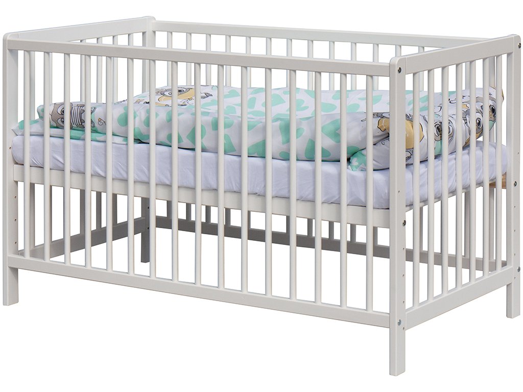 1. Dětská dřevěná postýlka 120x60 cm - bílá, masiv borovice, 3 vyndavací příčky, 5 poloh roštu
