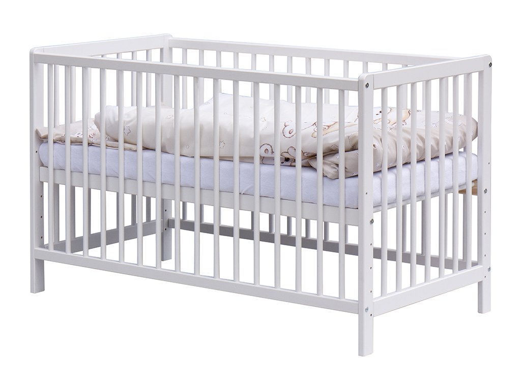 1. Dětská dřevěná postýlka 120x60 cm - bílá, masiv borovice, 3 vyndavací příčky, 5 poloh roštu