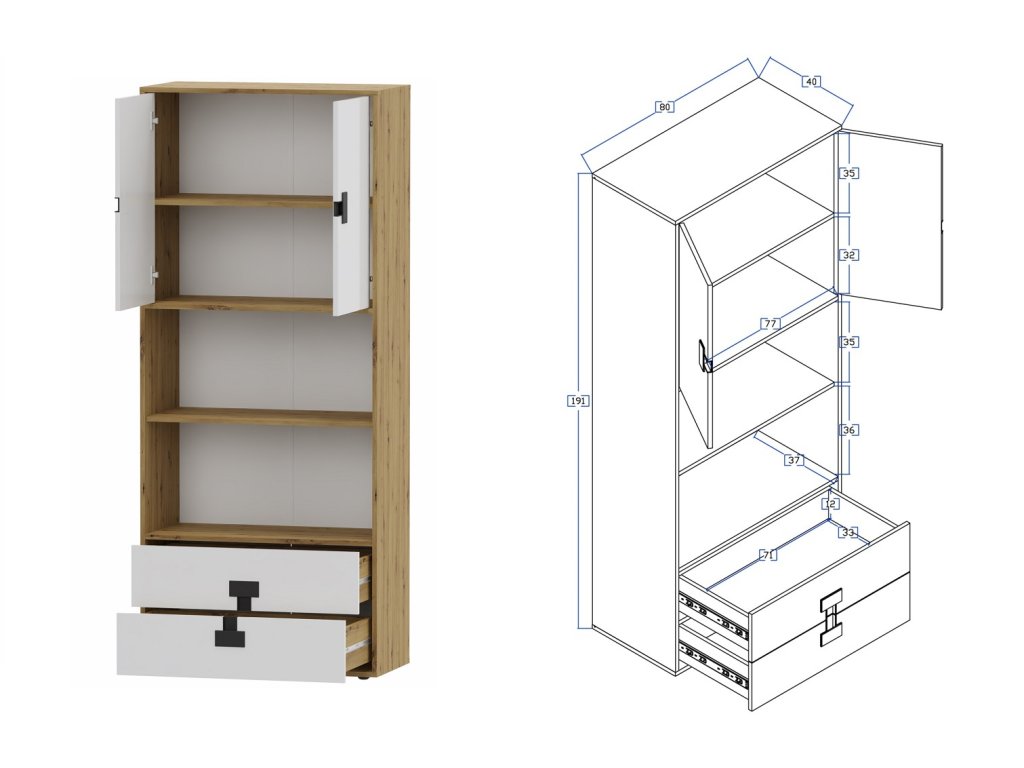 - dveře: bílý lesk, dub artisan lesk, šedý lesk