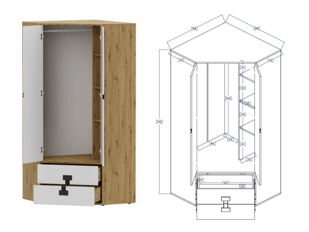 1x Šatní kříň rohová Index 02 - 88 x 191 x 88 cm